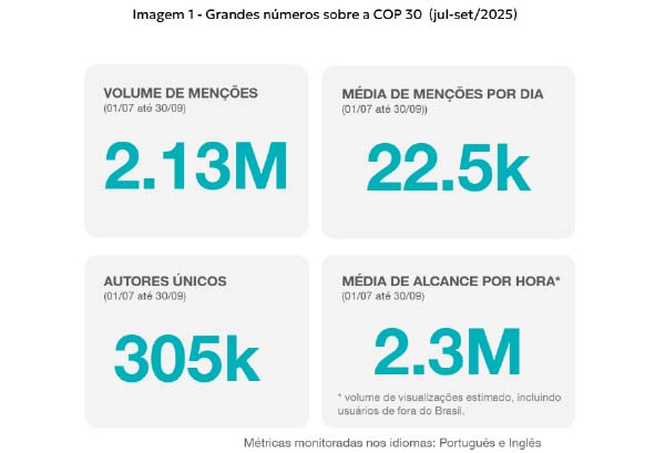 Entre 1º de julho e 30 de setembro, foram registradas 2,1 milhões de menções e 305 mil autores únicos falando sobre a COP30 nas redes sociais. O debate é intenso e global, com apurações nos idiomas português e inglês, e observou-se que as postagens sobre o tema tiveram um alcance médio estimado de 2,3 milhões de visualizações por hora.