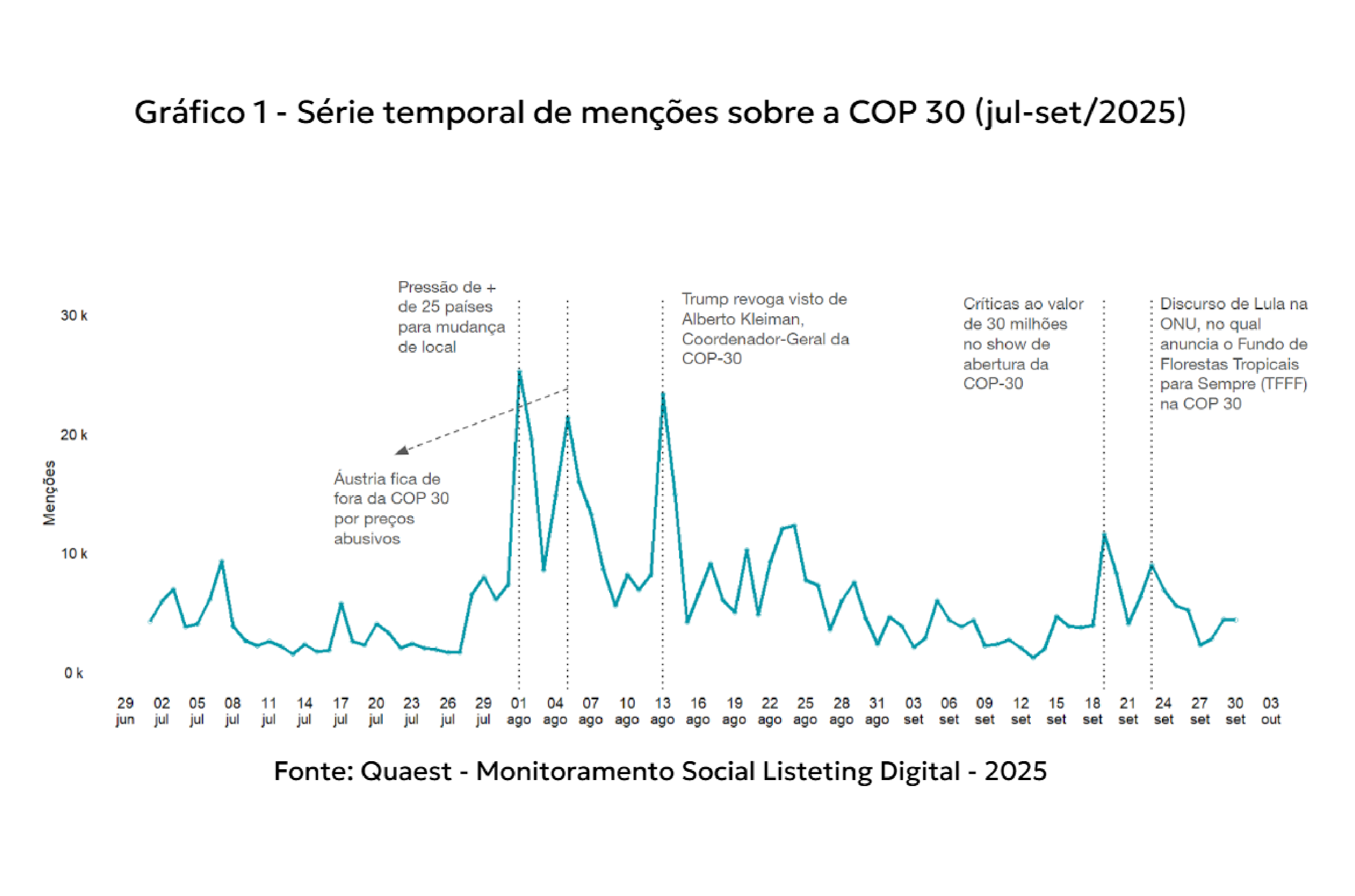 Entre julho e setembro de 2025, a Quaest realizou o primeiro monitoramento de opinião pública digital sobre a COP30, utilizando sua metodologia proprietária de Social Listening, uma tecnologia que identifica, classifica e analisa menções nas principais redes sociais e veículos de notícias on-line, no Brasil e no exterior. Essa abordagem permite mensurar a temperatura e o tom do debate público, revelando tendências, percepções e padrões de engajamento que ajudam a compreender como a conferência vem sendo discutida e interpretada na esfera digital.
