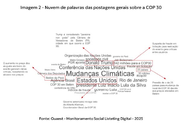 Entre os pontos negativos, prevalecem as críticas aos altos custos de realização, à infraestrutura de Belém e ao encarecimento da hospedagem e dos serviços locais. Também aparecem suspeitas de irregularidades em licitações e a repercussão de episódios diplomáticos, como a revogação do visto do coordenador-geral da COP30 pelos Estados Unidos. Esse conjunto de temas reforça uma percepção de descrédito e desconfiança, em que o evento é associado a ineficiência, desperdício de recursos e tensões políticas, especialmente em comparação a outras edições da conferência.