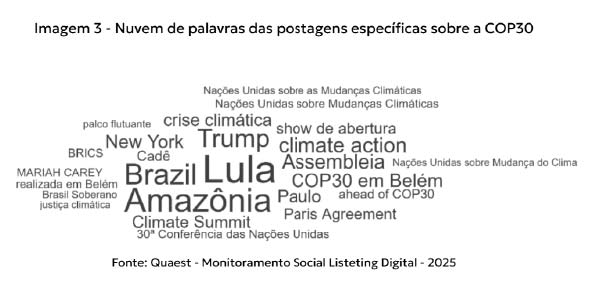 Já nas menções específicas, observa-se um debate mais voltado ao conteúdo das negociações e das agendas ambientais, com destaque para termos como “governo federal”, “justiça climática”, “povos indígenas”, “transição energética” e “impactos ambientais”. Ainda que representem apenas 20% do total das menções, essas discussões indicam um núcleo de engajamento mais qualificado, em que organizações, especialistas e lideranças socioambientais disputam narrativas sobre o papel do Brasil e sobre os caminhos possíveis para a descarbonização e o desenvolvimento sustentável.